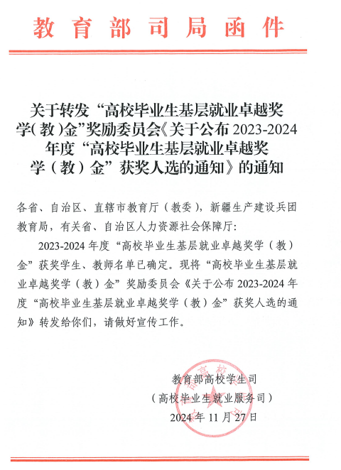 据悉,“高校毕业生基层就业卓越奖学(教)金”由教育部高校学生司(高校毕业生就业服务司)、教育部学生服务与素质发展中心共同指导,中国长江三峡集团有限公司出资,中国教育发展基金会设立,主要奖励赴基层就业并作出突出业绩的普通高校毕业生和普通高校指导服务大学生赴基层就业工作有突出贡献的教师。本次评选经各省(区、市)遴选推荐,全国共有398名高校毕业生获此项奖励,贵州省仅13人入选。(文/图:招就处 滕飞龙)