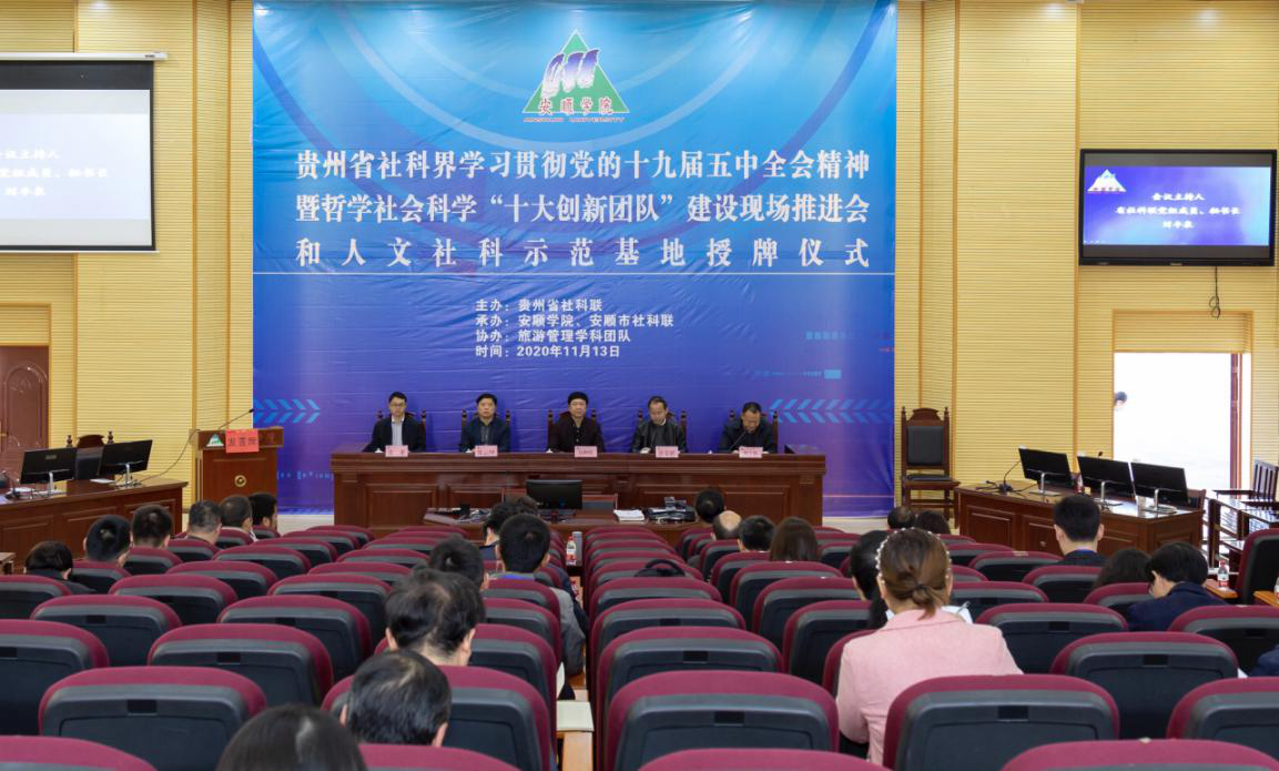 2020年11月13日下午,贵州省社科界学习贯彻党的十九届五中全会精神暨哲学社会科学“十大创新团队”建设现场推进会在奇乐棋牌模拟法庭召开。省社科联党组书记、副主席包御琨,奇乐棋牌党委书记罗荣彬、校长陈云坤、副校长张来,省社科联党组成员、秘书长刘丰泉,安顺市社科联党组书记高守应出席会议。全省市州社科联、2016至2019年40个哲学社会科学“十大创新团队”,2020年10个人文社科示范基地相关负责人参加会议。刘丰泉主持会议。