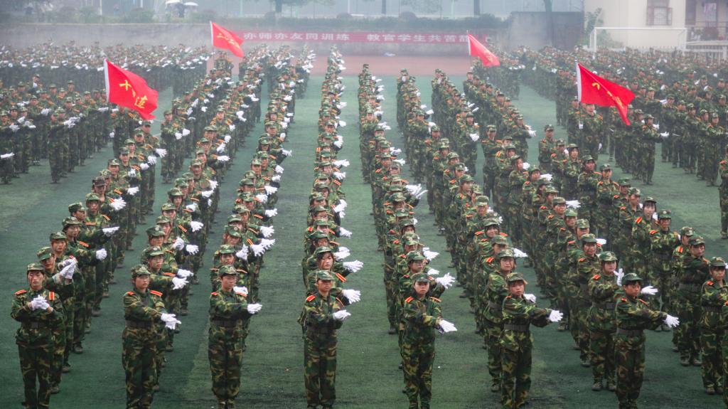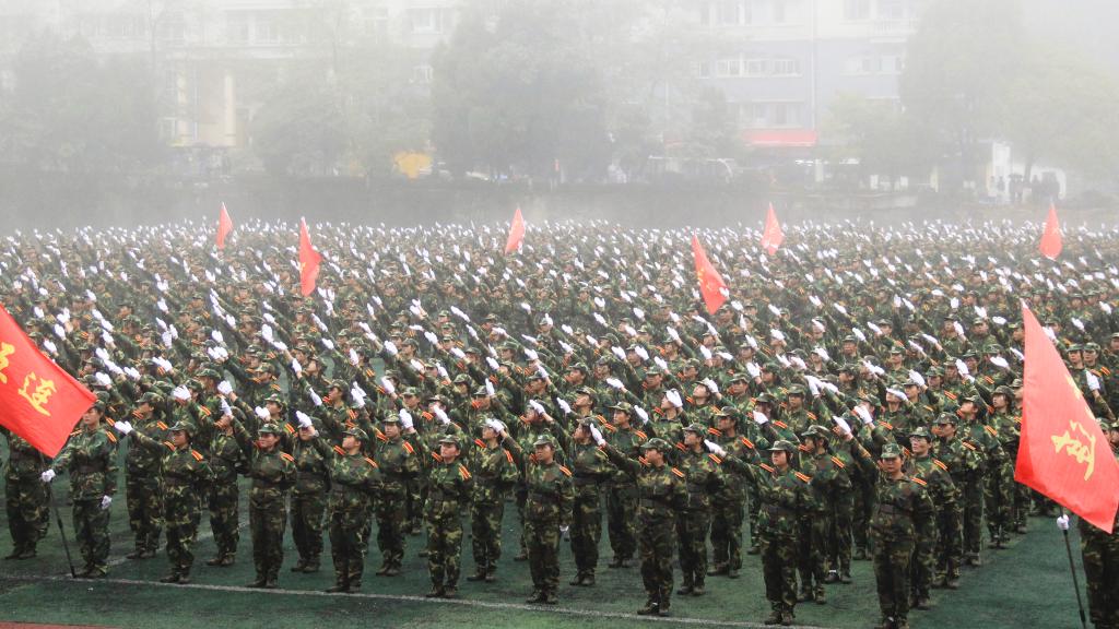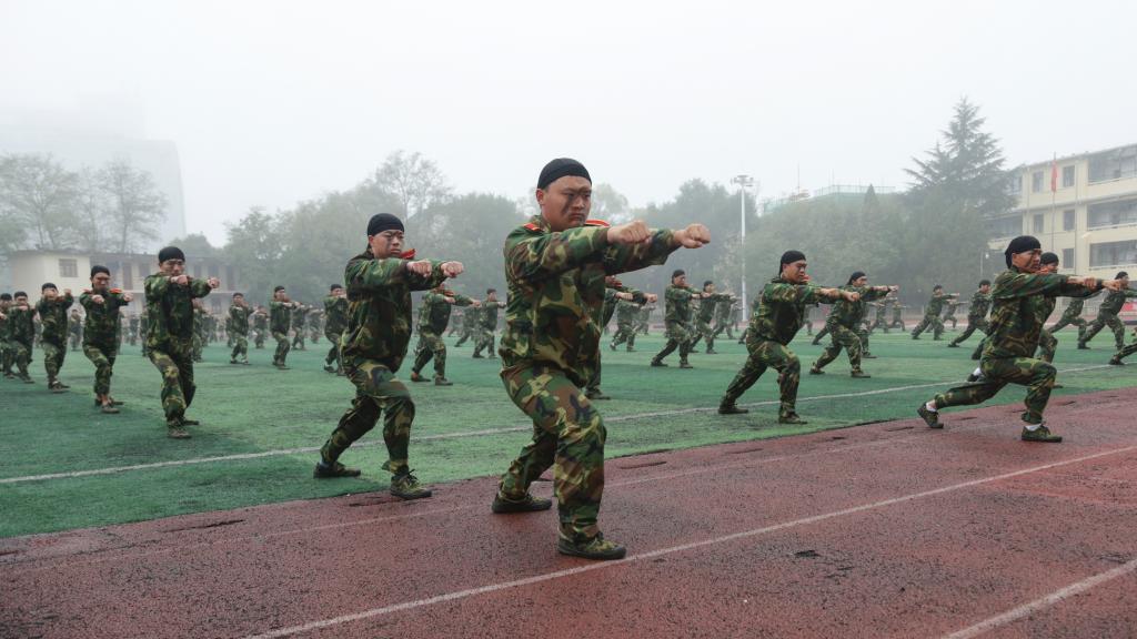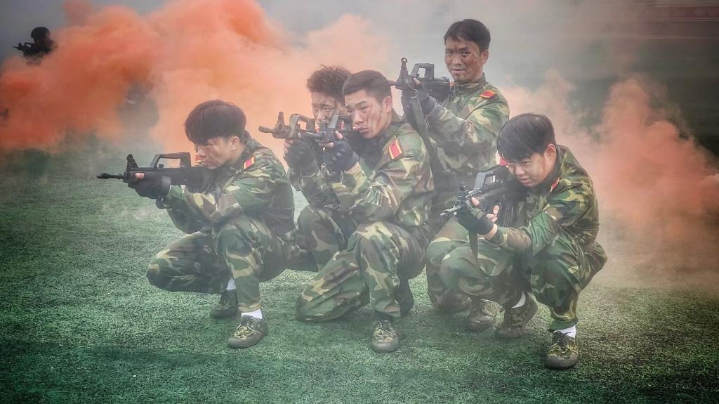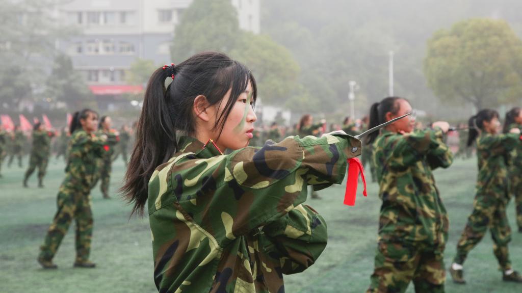 男子战术对抗,他们面涂迷彩、全副武装,在摆放于操场上的掩体后灵活穿梭,指挥着队友前进,让本次军训“军味”十足。