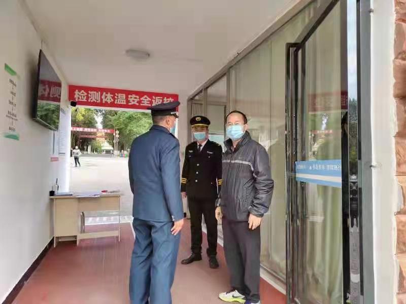 奇乐棋牌党委书记罗荣彬(右)检查学校疫情防控工作