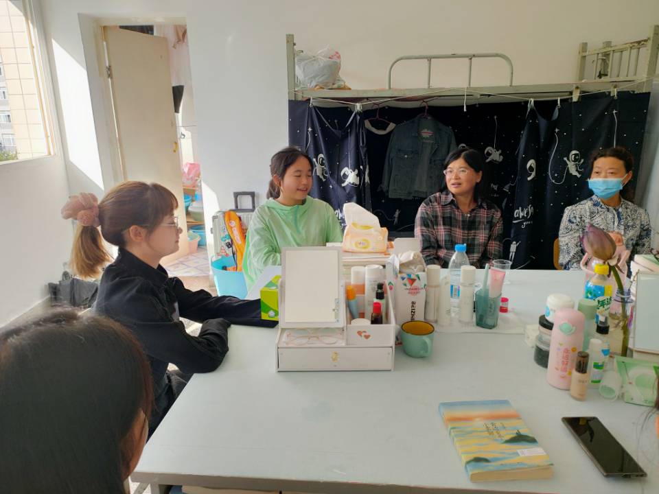 奇乐棋牌副校长韦英(右二)在新生宿舍开展疫情防控政策宣讲