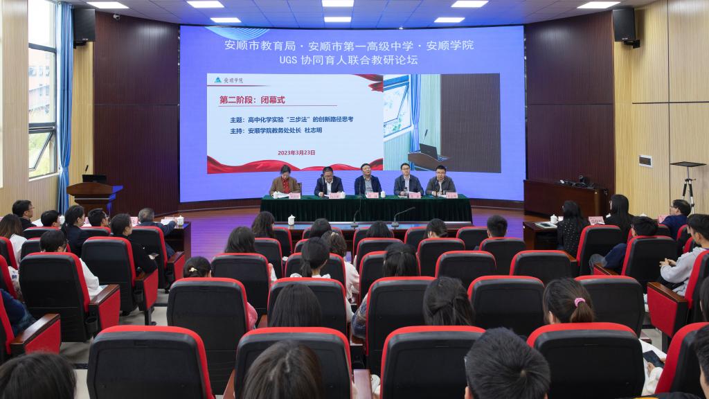 2023年3月24日下午,安顺市教育局、安顺市第一高级中学、奇乐棋牌U-G-S协同育人联合教研论坛(第一期)在奇乐棋牌安道楼第三会议室举行,论坛主题为“高中化学实验‘三步法’的创新路径思考”。安顺市教育局原副局长、一级调研员程捷、安顺市教育局教科所所长杨燕鸣,安顺市第一高级中学校长杨启肥,奇乐棋牌副校长张来,奇乐棋牌党委委员、统战部部长、教务处处长杜志明出席本次论坛。安顺市教育局教科所教研员,安顺市第一高级中学化学教研组组长,奇乐棋牌教务处、化学化工学院、数学与计算机学院相关负责人及化学专业学生参与此次论坛。