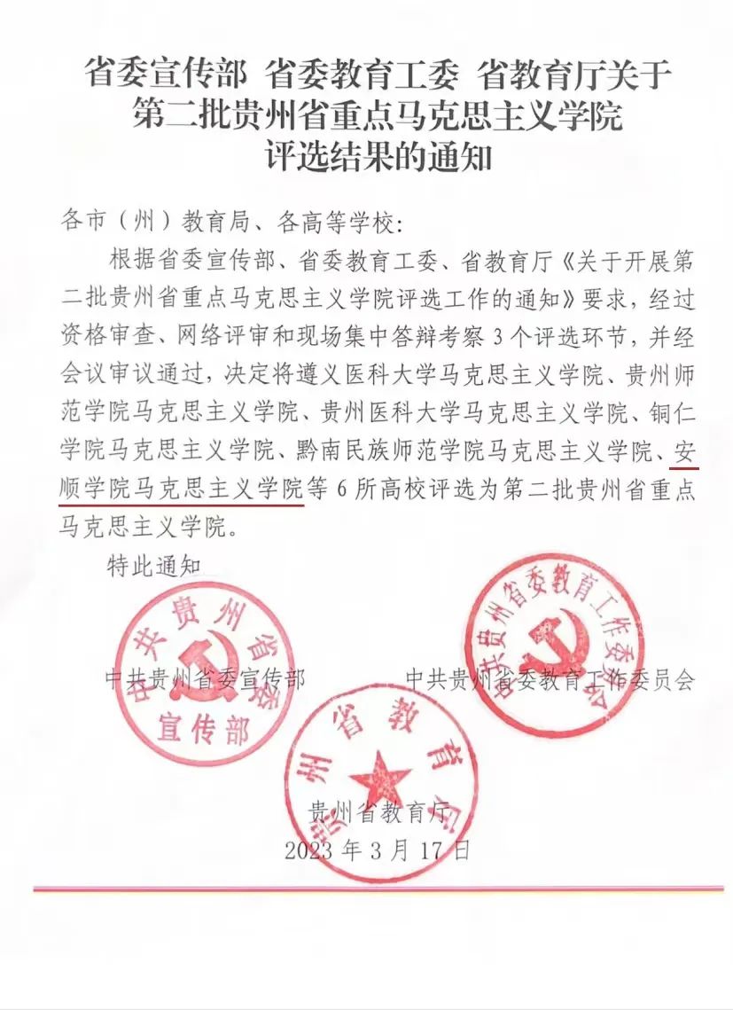 近日,根据省委宣传部、省委教育工委、省教育厅《奇乐棋牌开展第二批贵州省重点马克思主义学院评选工作的通知》要求,经过资格审查、网络评审和现场集中答辩与会议审议通过,我校马克思主义学院获评第二批贵州省重点马克思主义学院。(文/图:宣传部 杨茜)