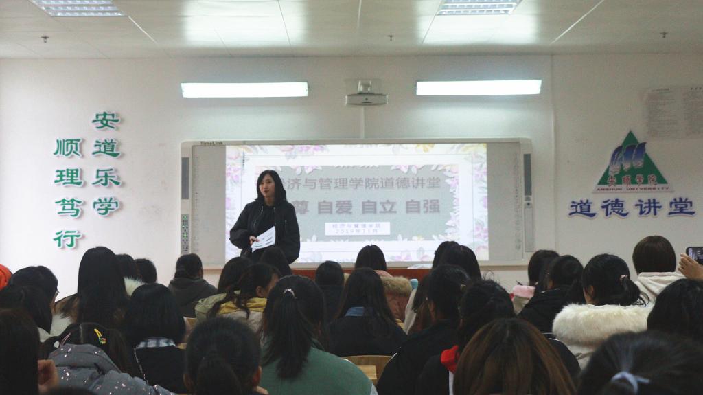 11月25日下午,我校道德讲堂开展“自尊 自爱 自立 自强”专题讲座,经济与管理学院辅导员胡晓青主讲,经济与管理学院2019级全体女生听讲。