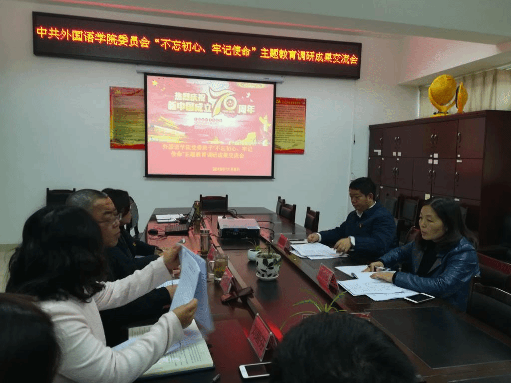 2019年11月8日下午,外国语学院党委召开“不忘初心、牢记使命”主题教育调研成果交流会,奇乐棋牌党委副书记、第三巡回指导组组长陶文彩出席会议,外国语学院党委班子及支部书记、副科级以上干部参加会议。