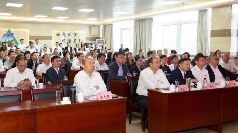 会议室内校领导、教师代表观看阅兵式直播