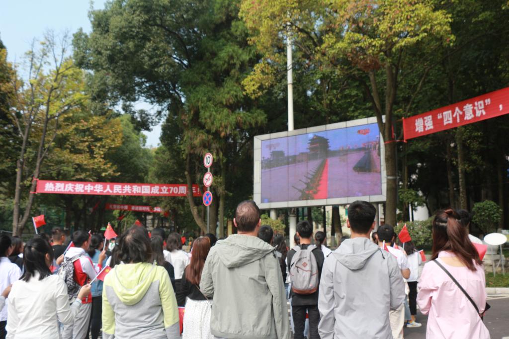 升旗仪式结束后,参会师生分别前往特教大楼7楼会议室、学校LED屏幕处观看国庆阅兵式直播。听到习近平总书记说:“没有任何力量能够撼动我们伟大祖国的地位,没有任何力量能够阻挡中国人民和中华民族的前进步伐”时,会议室观礼的校领导、教师及校园内观看直播的学生掌声雷鸣。阅兵盛典在70响礼炮及标兵铿锵有力的步伐中正式拉开了序幕。习近平主席乘着检阅车徐徐向东,迎着受阅将士的注目礼,检阅了我们威武列阵的方队,大家无不肃然起敬。看着海陆空各方队迈着整齐划一的正步意气风发地走过天安门广场接受党和人民的检阅,安院师生欢欣鼓舞,无比自豪。