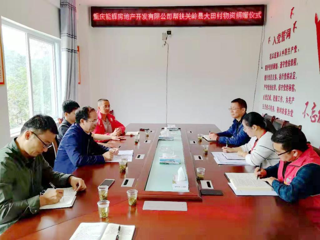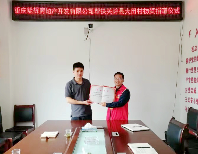 重庆能辉房地产开发有限公司副总经理赖江向大田村捐赠价值5万元的运动鞋并讲话,大田村驻村第一书记马永祥向赖江副总经理颁发了捐赠证书。