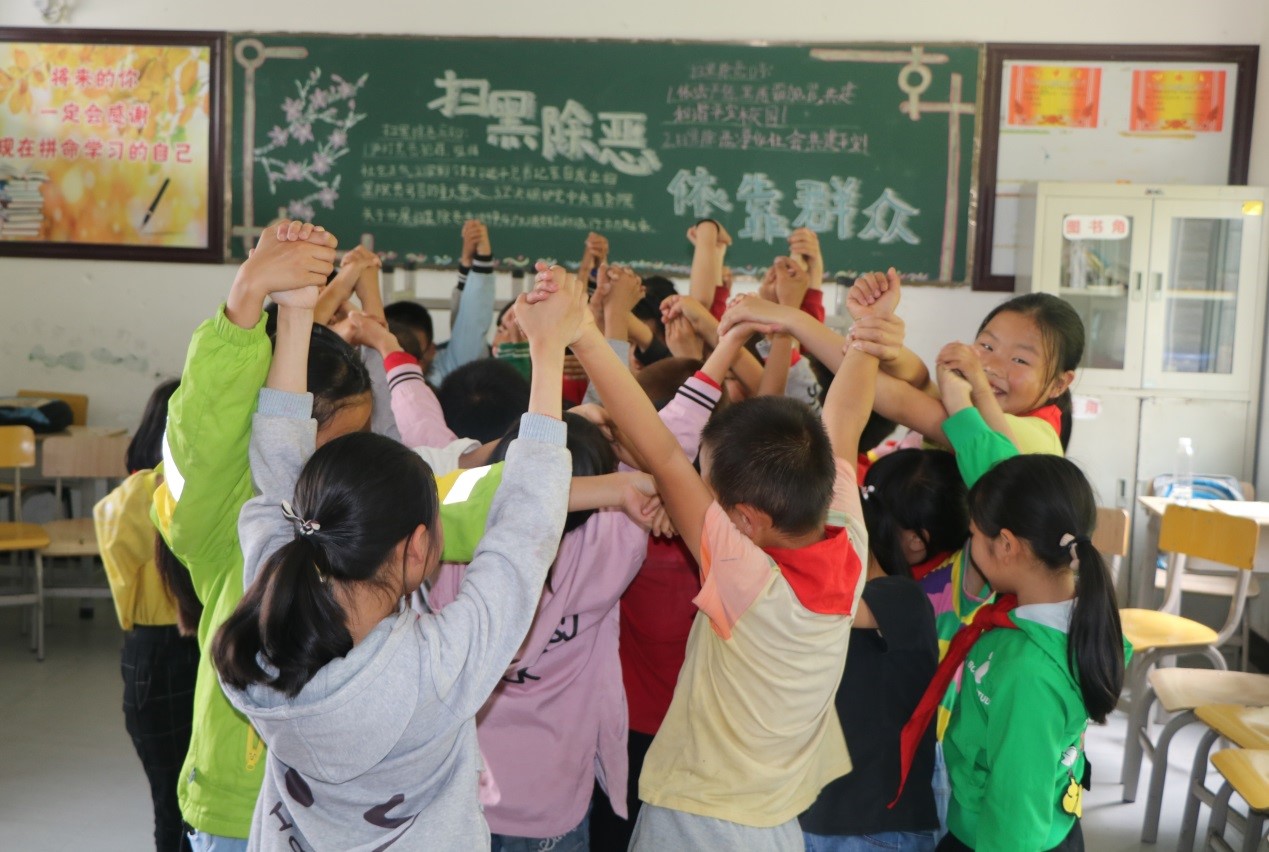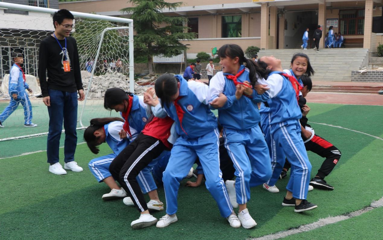 活动中,为小学生开展心理素质拓展训练,通过“萝卜蹲”、“大风吹”、“扫把传情”、“信任跌倒”、“解开千千结”等心理游戏,引导同学们感悟亲情与友情、遇到问题寻求支持与帮助,增强团队归属感和信任感,培养他们的积极心理品质。
