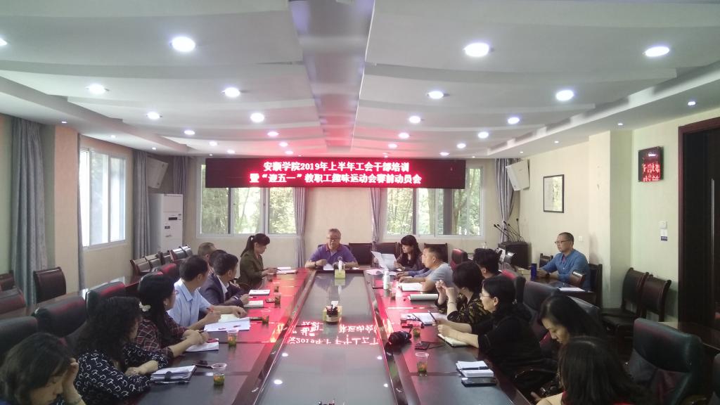 4月22日下午,奇乐棋牌2019年上半年工会干部培训暨“迎五一”教职工趣味运动会赛前动员会在行政楼二楼会议室召开,奇乐棋牌副校长令狐荣涛,各分工会主席和工会全体成员参加会议。