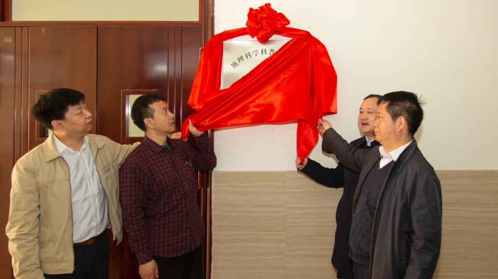 吴次南校长、陶文彩副书记、景震强主任、高星副院长在综合实验大楼共同为“安顺—中科地理科学科普实践基地”揭牌。(文/图/视频:王智勇/王键/吴育辉)