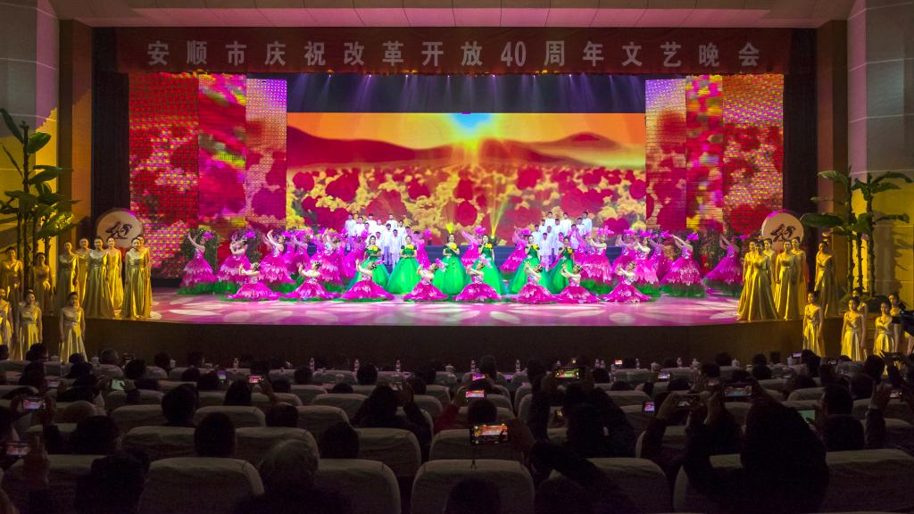 市文化中心灯火璀璨、气氛祥和。文艺晚会以歌舞《春天的故事》开场,分“奋进四十载”、“筑梦新未来”两个篇章进行,包括歌舞、小品、杂技、快板、情景剧等表演形式,生动展示了安顺市改革开放40周年的辉煌成就和全市人民昂扬奋进的精神面貌。