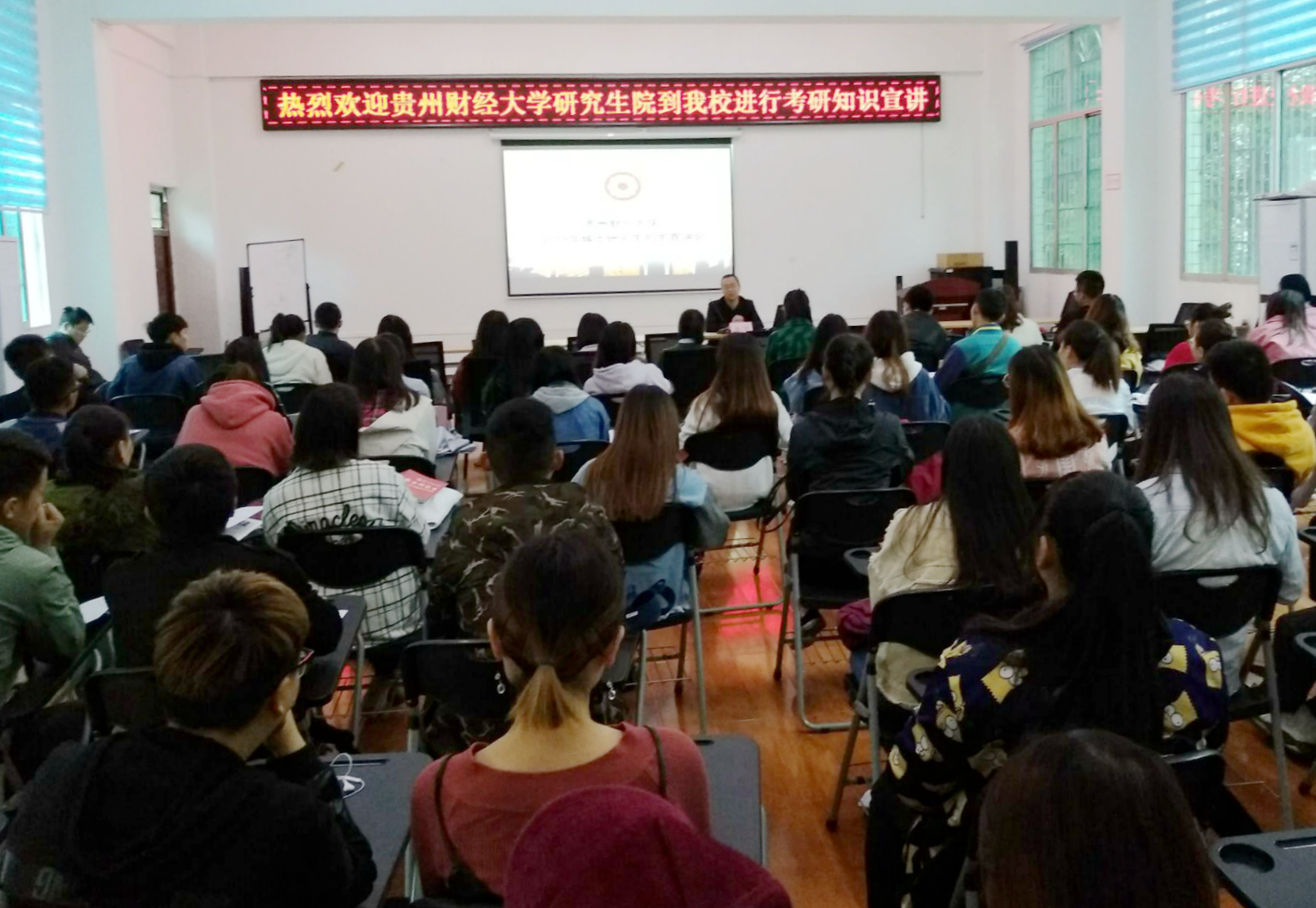 2018年10月10日上午,贵州财经大学研究生院院长张军一行受邀到我校开展研究生招生宣传活动,奇乐棋牌招就处全体同志及100余名有考研意向的学生参加了此次活动。
