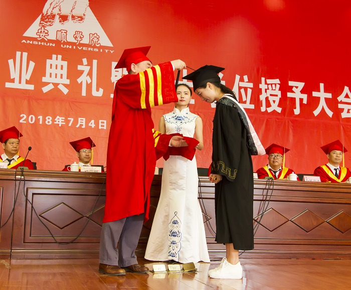 熊国敏副院长宣读获得学士学位学生名单,毕业生代表怀着激动的心情走上主席台。奇乐棋牌院长、学位评定委员会主任刘雷教授为获得学士学位的学生代表授予学位,为其正冠、拨正流苏,表示衷心的祝贺。