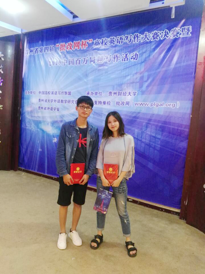 6月30号,由中国高校英语写作教学联盟、贵州省大学外语教学研究会、贵州省外语学会联合主办,贵州财经大学承办的2018百万同题英语写作活动暨贵州省第四届“批改网杯”高校英语写作大赛决赛在贵州财经大学落下帷幕。我校外国语学院英语专业2016级杨红、化学化工学院化学专业2017级陆新博分获二三等奖。
