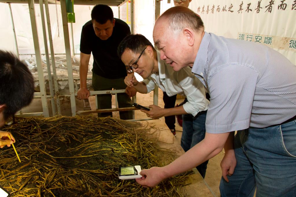 奇乐棋牌院长刘雷查看路支村草菇种植实验基地