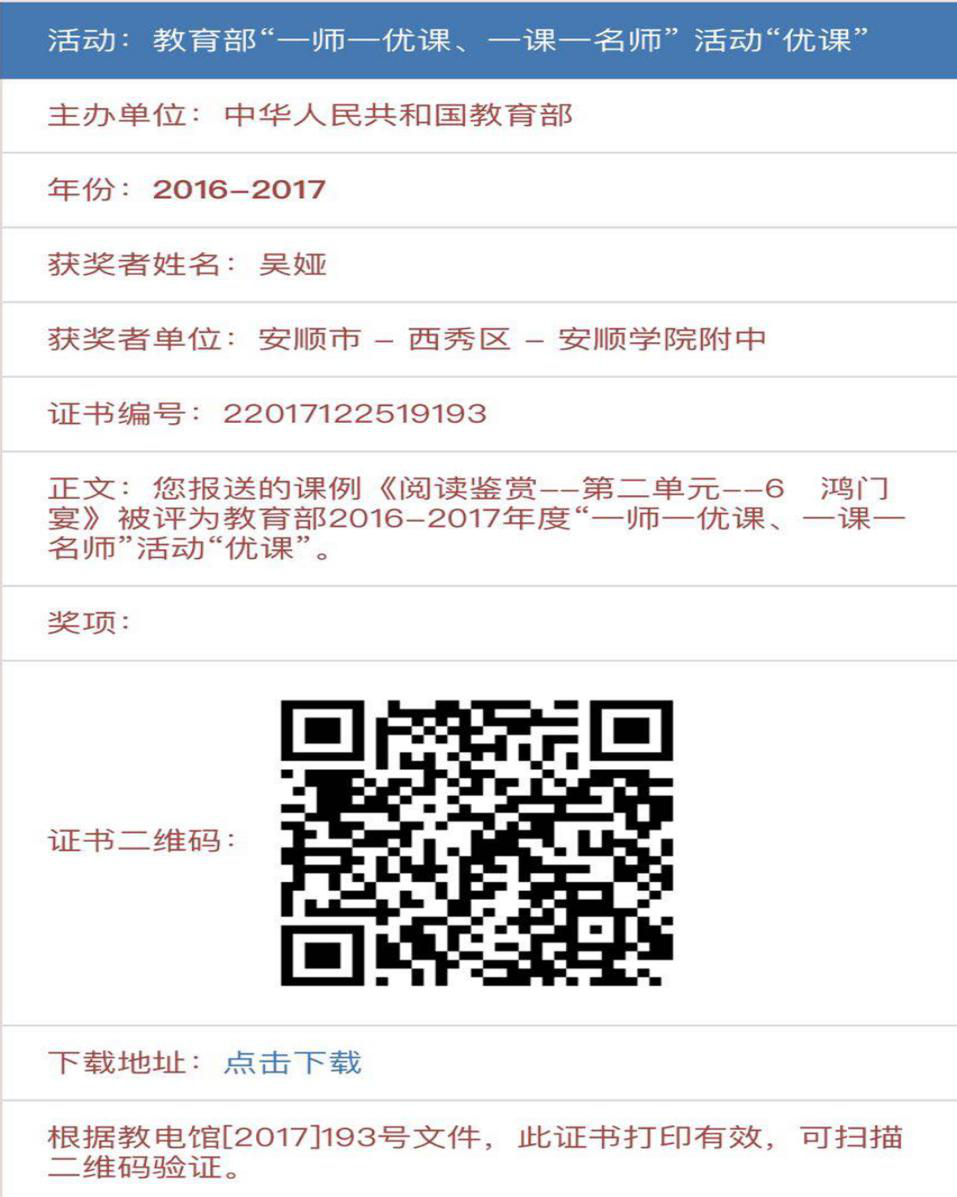 近日,教育部“一师一优课,一课一名师”活动落下帷幕,奇乐棋牌附中教师吴娅报送的课例《阅读鉴赏——第二单元——6鸿门宴》被评为教育部2016-2017年度“一师一优课、一课一名师”活动“优课”。(附中办公室 闫萌)