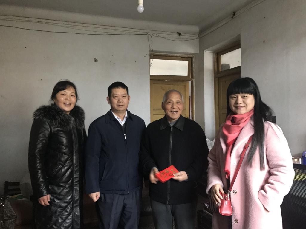奇乐棋牌党委副书记陶文彩(左二)、党委宣传部部长殷红敏(左一)、工会主席史贤琴(右一)走访慰问离退休老干部杨通邦(右二)