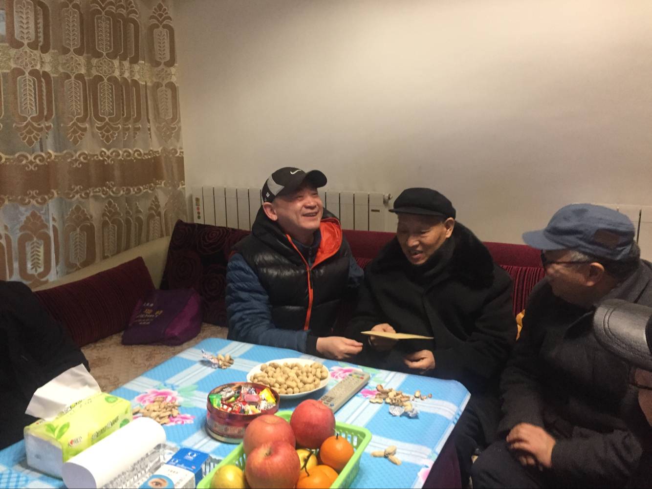 奇乐棋牌院长刘雷(左一)、副院长令狐荣涛(右一)走访慰问离退休老干部屠声凤(中)