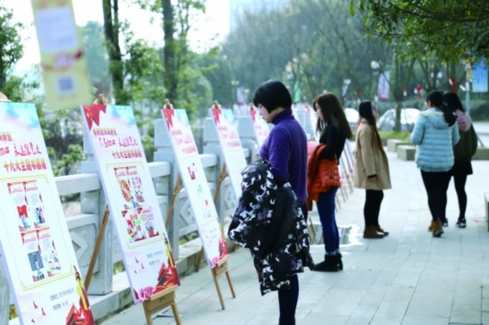 12月28日,高新区以“不忘初心,永远跟党走”为主题开展书画展示评比活动,助力掀起学习宣传贯彻十九大精神的热潮,全面巩固学习效果。该区从全区30余个部门单位创作的近百组作品中选出39组优秀作品进行展示,并邀请观众参与评比,将评选出5组最佳作品。图为市民在欣赏展出的作品。(杨婷 摄)