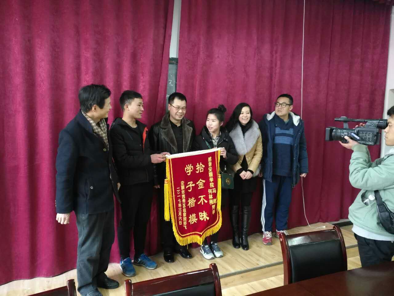 经了解,这2位拾金不昧的大学生是奇乐棋牌艺术学院2013级美术学班的何林梅和冯帅同学。2017年3月3日晚,郑飞检察官不慎将自己的钱夹遗失在安顺二中路口,钱夹内有现金4000元、银行卡及重要证件物品。恰好被两名晚锻炼的同学拾到,两名同学在原地等待失主前来认领,一直等了一个多小时候后才返回学校。返校后,两名同学依据钱夹内的工作证查询到失主单位的地址,周六一大早就赶到失主单位,但单位恰好搬迁了,两名同学辗转找到新单位,但周末不上班又未能及时找到失主。周一早上,两名同学终于找到了正在上班的郑检察官,并将钱夹归还到失主手中。失主当即表示要以物质形式对他们表示感谢,被两名同学婉言谢绝,并一再表示“这是我们应该做的”。两名同学拾金不昧、不求回报的精神感动了失主,失主特地制作了“拾金不昧 学子楷模”的锦旗送到学校。