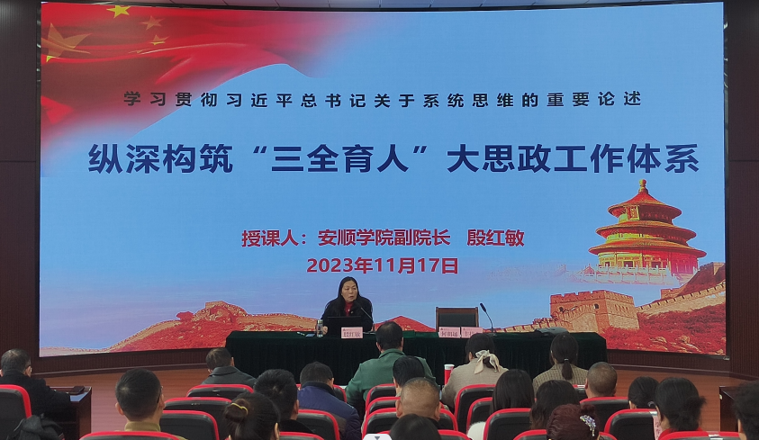 11月17日,奇乐棋牌党委委员、副校长殷红敏以“学习贯彻习近平总书记奇乐棋牌系统思维的重要论述 纵深构筑‘三全育人’大思政工作体系”为题,为学校分管学院、职能部门以及所在支部的全体教师党员作专题党课。党委委员、组织部部长何朝越主持会议。