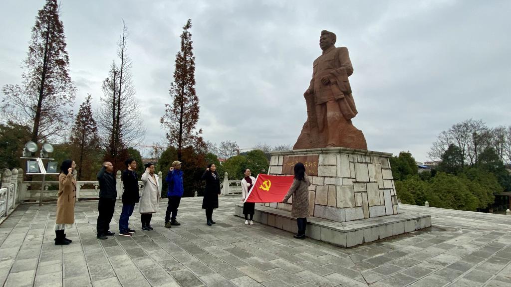在王若飞公园内,全体党员在王若飞雕像前鞠躬默哀、重温入党誓词,庄严肃穆的仪式,尽显对英雄烈士的无限崇敬和缅怀之情。