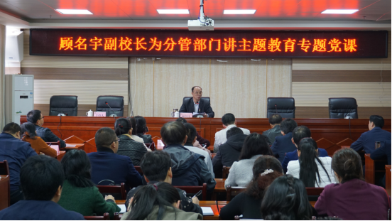 顾名宇副校长结合“不忘初心、牢记使命”主题教育活动开展以来的学习思考、工作调研、检视问题和整改的实际,围绕“深刻理解‘不忘初心、牢记使命’的丰富内涵”、“坚持刀刃向内,认真检视存在的问题”、“牢记初心使命,勇于担当作为”三个方面,讲解了中国人民从1840年鸦片战争以来的探索史,中国共产党人98年以来的守初心担使命的奋斗历程。