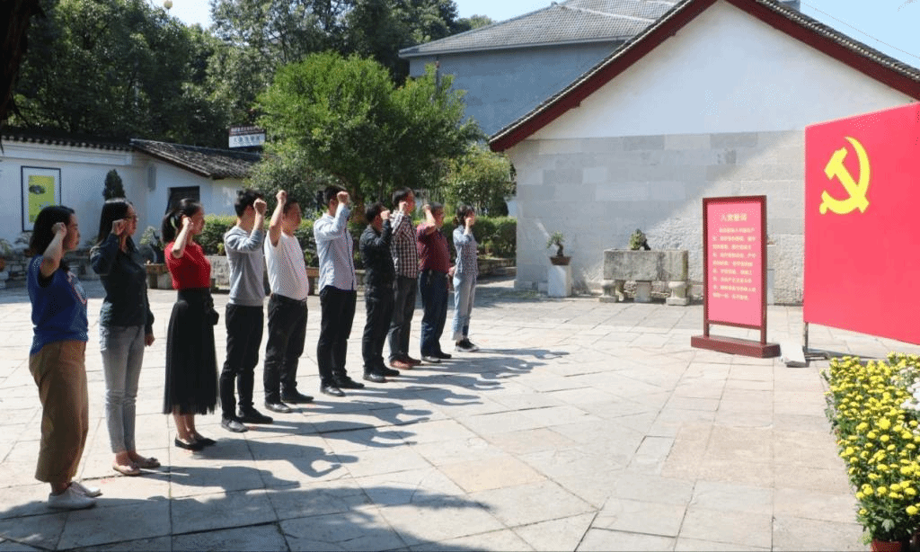 支部成员首先重温入党誓词。旅游学院党员教师在王若飞雕像和中共共产党党旗前举起右手,庄严宣誓。随后,在解说员的引领下参观王若飞故居及陈列馆。党员教师们一边认真聆听解说员的讲解,一边认真参观学习。