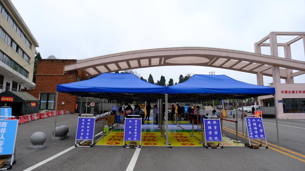 在校门口,返校学生完成行李消杀、体温检测、身份核验、扫码等程序后,有序报到进校。