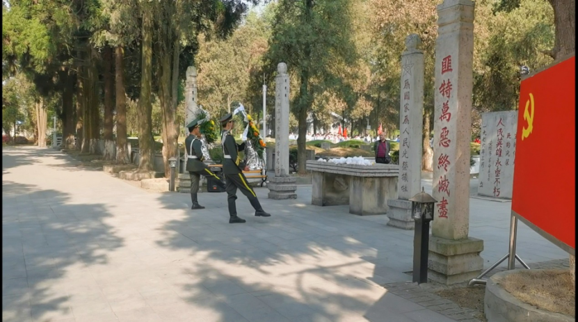 活动仪式在庄严的音乐声中开始,退役大学生士兵向王若飞烈士墓敬献花篮,并集体默哀。