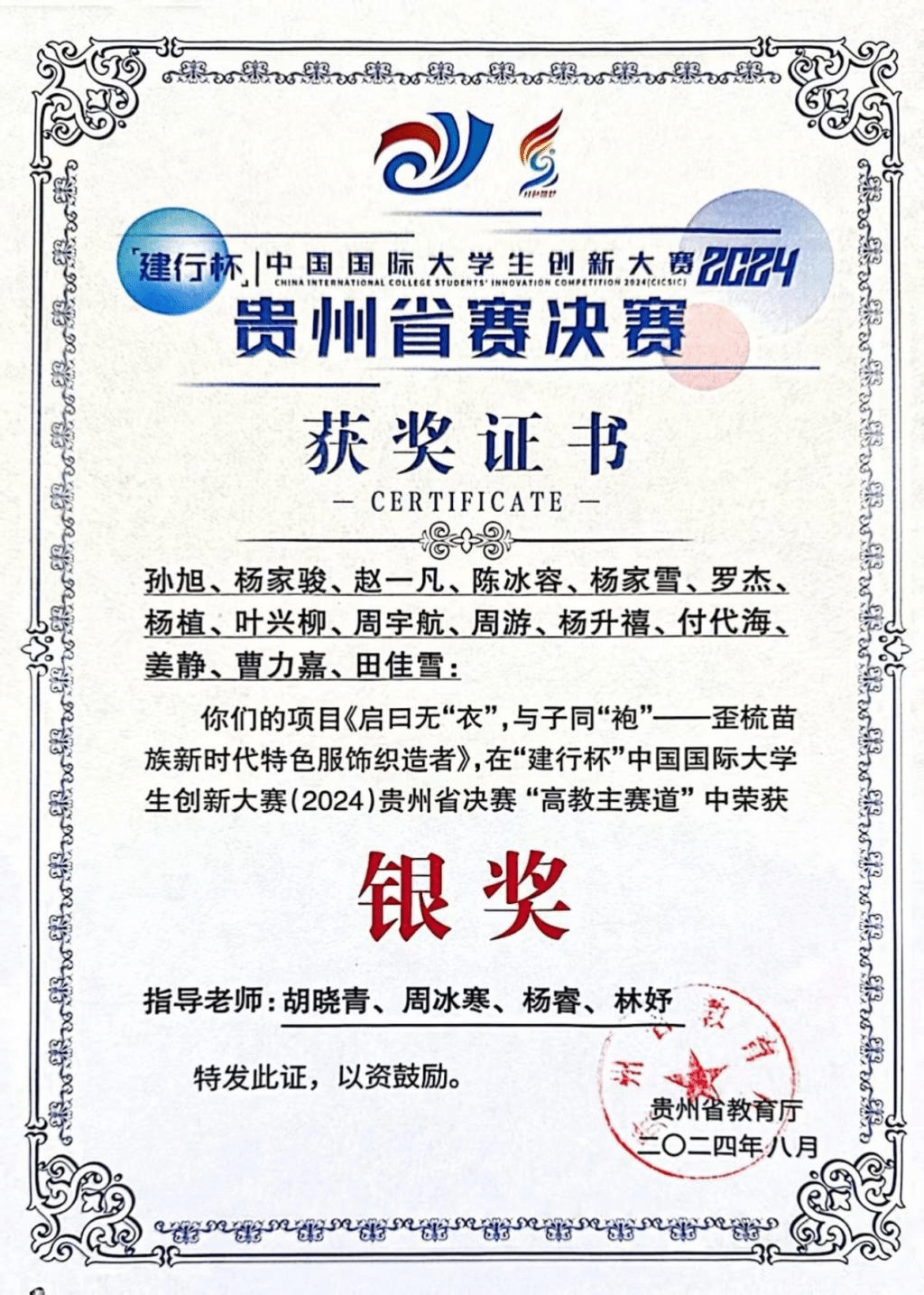 孙旭同学负责的《启曰无“衣”,与子同“袍”》项目—获得中国国际大学生创新大赛(2024)贵州省级银奖