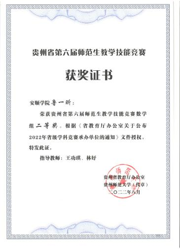 1.以专业技能训练为中心,提高学生专业技能。开展三笔字“周周练”活动;推行中学教师与高校教师联合指导师范教学技能,落实实习试讲与考评,提升师范生上岗实习水平,促进高校与中学课堂有效衔接;以企业实践项目为主题,选派企业导师开展工科专业实践实训,提升工科人才知识应用能力。在贵州省师范生教学技能大赛中荣获省级二等奖、三等奖共3项。