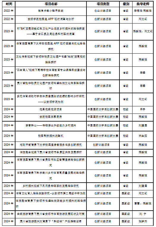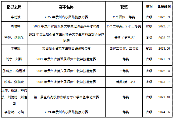(1)体育学院高度重视校园体育文化建设,注重以体育人、以文化人、立德树人,结合专业特色实际,不断提升工作水平、改进工作方式、拓宽工作途径,落实健康第一、在体育锻炼中享受乐趣、增强体质、健全人格、锤炼意志的新时代体育工作要求,持续广泛开展主题突出、特色鲜明的校园体育文化活动,营造健康向上的校园文化氛围,构筑全方位多层次的校园体育文化育人体系。依托贵州省少数民族体育训练基地,通过课程、活动、实践、服务等形式,把地方优秀文化和民族传统体育项目引进校园、引进教材、引进课堂,《少数民族传统体育》课程作为专业限选必修课纳入课程体系,射弩、板鞋竞速、高脚竞速、押加、陀螺、表演、蹴球、健身气功等传统体育项目内容融入专业课程。体育学院师生代表安顺市参加省第十届少数民族传统体育运动会取得了2个一等奖、17个二等奖、22个三等奖的好成绩。