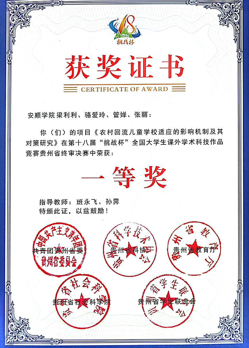 第十八届“挑战杯”全国大学生课外学术科技作品竞赛贵州省省赛一等奖