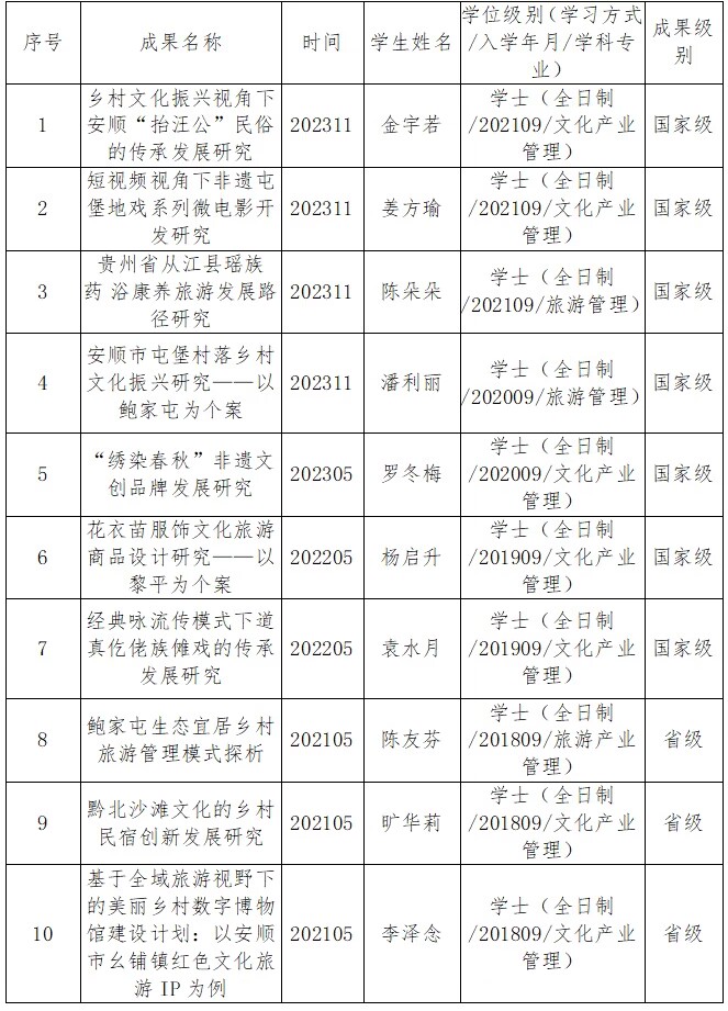 学院人才培养目标符合学校的定位,以培育具备良好职业道德、专业技能及创新能力的专业人才为目标,强调实践能力与综合素质的培养。围绕应用型人才培养任务,依托“华中师范大学国家文化产业研究中心安顺旅游文化产业研究基地”“安顺旅游文化产业研究基地”、教育部“黄果树大学生校外实践教育基地”、教育厅“安顺屯堡傩雕旅游商品研发基地”等平台,加上省内外20多家学生实习实践基地,形成了综合立体的学生实习实践平台,强化实践教学,促进学生全面发展。