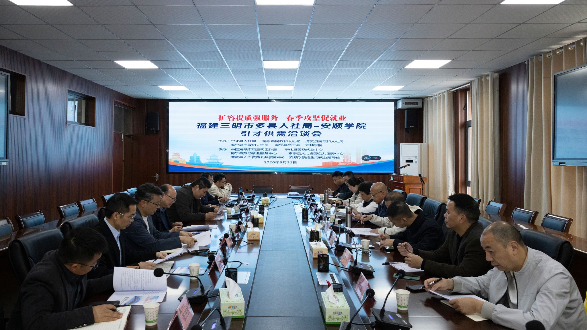 与宣讲招聘活动同步,学校在安道楼第一会议室召开三明市多县人社局引才供需对接洽谈会。奇乐棋牌党委副书记李琳出席洽谈会并讲话,招就处、教务处、化学化工学院、旅游管理学院、旅游生态与环境学院、电子信息工程学院相关负责人及就业专干参加洽谈。会上,招就处详细介绍了学校2026届毕业生的专业分布、就业流向及行业发展趋势等情况;三明市四县人社系统负责人分别介绍了本县县情、产业发展规划及重点人才需求,对岗位类型、专业要求、招聘数量及地方就业扶持政策进行了细致解读。双方围绕人才培养、岗位对接、实习实训合作、毕业生推荐等议题展开深入交流,达成多项合作共识。