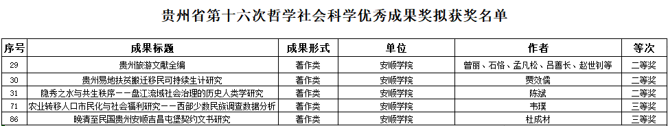 其中,曾丽、石恪、孟凡松、吕善长、赵世钊等老师的著作《贵州旅游文献全编》,贾效儒老师的著作《贵州易地扶贫搬迁移民可持续生计研究》,陈斌老师的著作《隐秀之水与共生秩序——盘江流域社会治理的历史人类学研究》拟荣获二等奖;韦璞老师的著作《农业转移人口市民化与社会福利研究——西部少数民族调查数据分析》,杜成材老师的著作《晚清至民国贵州安顺吉昌屯堡契约文书研究》拟荣获三等奖。