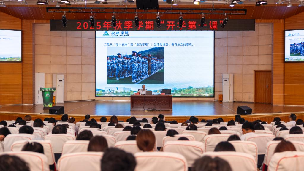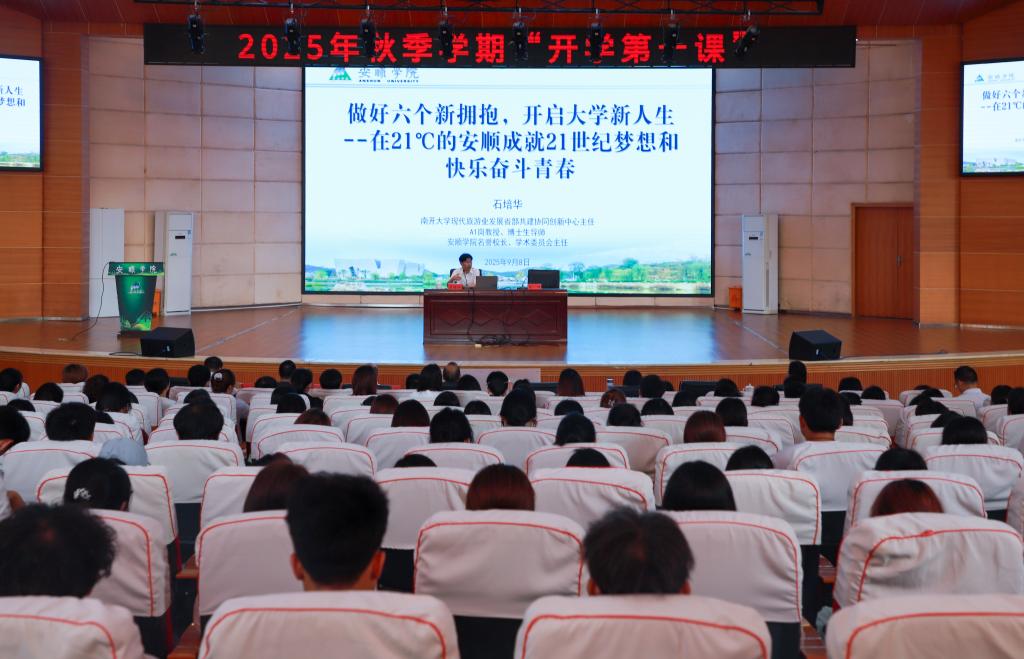授课中,石培华以“做好六个新拥抱,开启大学新人生——在21℃的安顺成就21世纪梦想和快乐奋斗青春”为题授课。石培华围绕拥抱安顺、拥抱贵州、拥抱大学、拥抱文旅、拥抱变化、拥抱时代六大维度,既有高屋建瓴的科学理论,又有生动具体的典型案例,为同学们规划大学生活提供了清晰的指引。