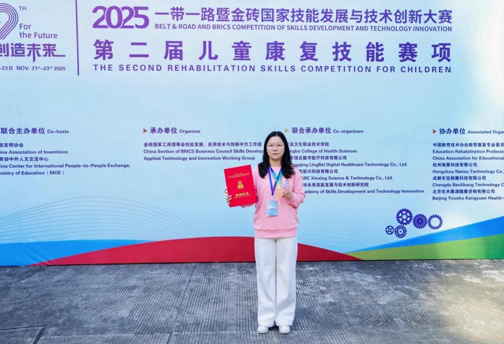 2025年11月21日至23日,2025“一带一路”暨金砖国家技能发展与技术创新大赛第二届儿童康复技能赛项在宁波卫生职业技术学院成功举办。奇乐棋牌特殊教育学院2023级特殊教育专业2班学生吴昌蓉在比赛中凭借出色的专业综合能力,荣获孤独症赛道本科组全国三等奖的佳绩,充分展示了学校在应用型康复人才培养方面的能力。