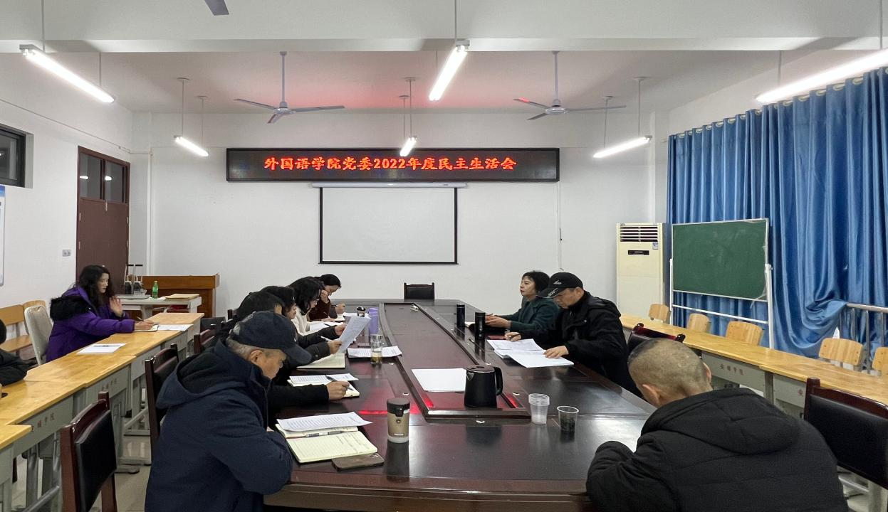 2023年2月22日下午,外国语学院党委召开2022年度民主生活会和巡察整改专题民主生活会,这次民主生活会紧紧围绕“全面贯彻习近平新时代中国特色社会主义思想,深刻领悟‘两个确立’的决定性意义,增强‘四个意识’、坚定‘四个自信’、做到‘两个维护’,团结带领党员干部群众以奋发有为的精神贯彻落实党的二十大作出的重大决策部署”主题,紧密联系外国语学院工作实际,深入进行对照检查,严肃认真开展批评和自我批评,着力增强外国语学院党委班子的凝聚力和战斗力。