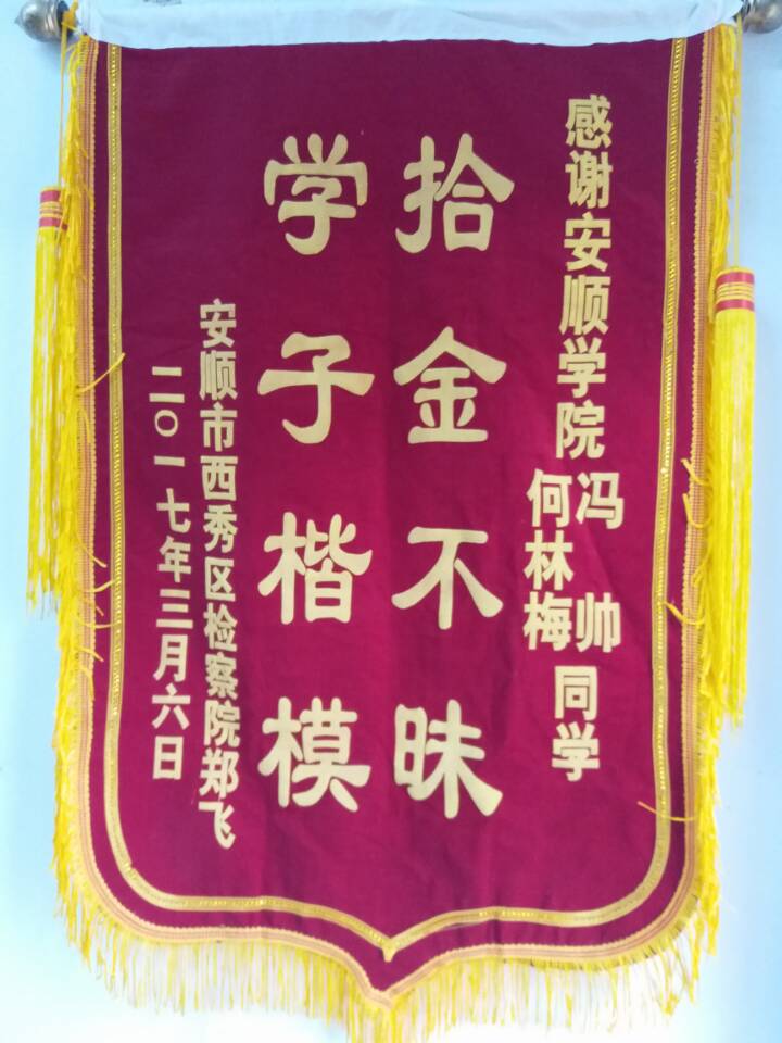 经了解,这2位拾金不昧的大学生是奇乐棋牌艺术学院2013级美术学班的何林梅和冯帅同学。2017年3月3日晚,郑飞检察官不慎将自己的钱夹遗失在安顺二中路口,钱夹内有现金4000元、银行卡及重要证件物品。恰好被两名晚锻炼的同学拾到,两名同学在原地等待失主前来认领,一直等了一个多小时候后才返回学校。返校后,两名同学依据钱夹内的工作证查询到失主单位的地址,周六一大早就赶到失主单位,但单位恰好搬迁了,两名同学辗转找到新单位,但周末不上班又未能及时找到失主。周一早上,两名同学终于找到了正在上班的郑检察官,并将钱夹归还到失主手中。失主当即表示要以物质形式对他们表示感谢,被两名同学婉言谢绝,并一再表示“这是我们应该做的”。两名同学拾金不昧、不求回报的精神感动了失主,失主特地制作了“拾金不昧 学子楷模”的锦旗送到学校。