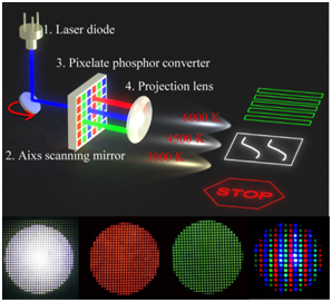 随着人工智能和无人驾驶时代的到来,提供具有超亮度、高穿透性和高空间分辨率的激光驱动自适应照明是必然趋势,而利用激光驱动像素化荧光转换器是最好的解决方案之一。然而,由于商用荧光粉颗粒尺寸较大,实现高性能像素化荧光转换器是一项极具挑战的工作。基于该新颖的设计策略,首次成功制备了全彩色pixelated-film@Ag。激光驱动的白色像素光和全彩像素光的实现,将在智能自适应照明和柔性大屏幕显示领域展现出很大的应用潜力。