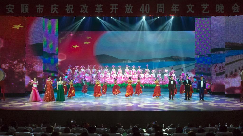 市文化中心灯火璀璨、气氛祥和。文艺晚会以歌舞《春天的故事》开场,分“奋进四十载”、“筑梦新未来”两个篇章进行,包括歌舞、小品、杂技、快板、情景剧等表演形式,生动展示了安顺市改革开放40周年的辉煌成就和全市人民昂扬奋进的精神面貌。