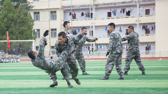 在汇报表演阶段,教官队和我校退役复学大学生进行了反恐战术和擒敌拳表演。现场气氛热烈,掌声雷动。