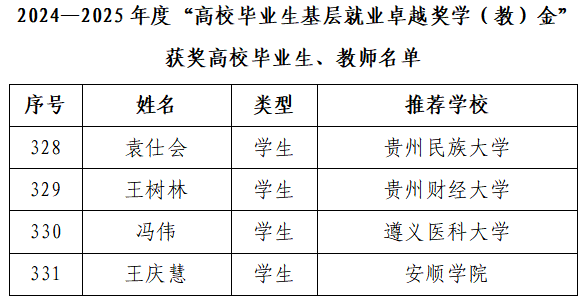 “全国高校毕业生基层就业卓越奖”奖励对象为近10年赴基层就业并做出突出业绩的普通高校毕业生和普通高校指导服务大学生赴基层就业工作有突出贡献的教师。每年评选一次。据悉,此次全国仅418人获得表彰,贵州省仅14名毕业生入选。