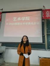 会议共分7个议程,首先由蒋晓昀书记致辞欢迎新同学的到来,并希望同学们在大学四年要努力提高自身素养,加强人际交往,并祝愿同学们一切顺利。接下来何谦副院长给同学们介绍了美术学和设计学学科专业特点;李艺老师介绍了音乐学学科专业特点;学生科张琪老师介绍了考勤制度与学生自我管理事宜;团总支书记全坤老师介绍团总支学生会的基本情况,并鼓励2020级新同学积极加入学生会;学生科科长蔡跃老师介绍了奖助贷勤工作流程以及发展学生党员的相关事宜。