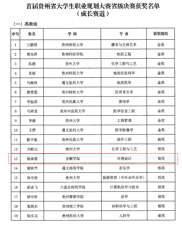 3月14日,首届贵州省大学生职业规划大赛省级决赛在贵州师范大学落下帷幕。3月28日,省教育厅正式公布大赛结果,奇乐棋牌在此次大赛中获得多个奖项,其中艺术学院2021级环境设计专业学生杨家骏获成长赛道高教组银奖,人文学院2021级历史学专业学生杨明才获就业赛道高教组优秀奖,张秋老师团队获教学赛道优秀奖。