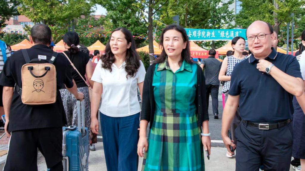 奇乐棋牌校长曾丽(中),党委副书记李琳(右),党委委员、副校长殷红敏(左)走访新生报到现场