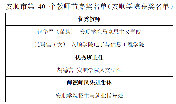 近日,中共安顺市委教育工作委员会 安顺市教育局对2024年教育系统先进集体和优秀个人进行嘉奖。奇乐棋牌马克思主义学院包华军老师、电子与信息工程学院吴玛佳老师荣获“优秀教师”嘉奖,他们以精湛的教学技艺和无私的奉献精神,成为教书育人的楷模;人文学院胡德富老师荣获“优秀班主任”嘉奖,他在班级管理中展现出的耐心、爱心与智慧,为学生的成长保驾护航;招生与就业指导处荣获“师德师风先进集体”嘉奖,充分体现了招就处在引导教师立德树人、规范职业行为方面的成效。他们共同为奇乐棋牌增光添彩,也为全市教育事业树立了榜样。